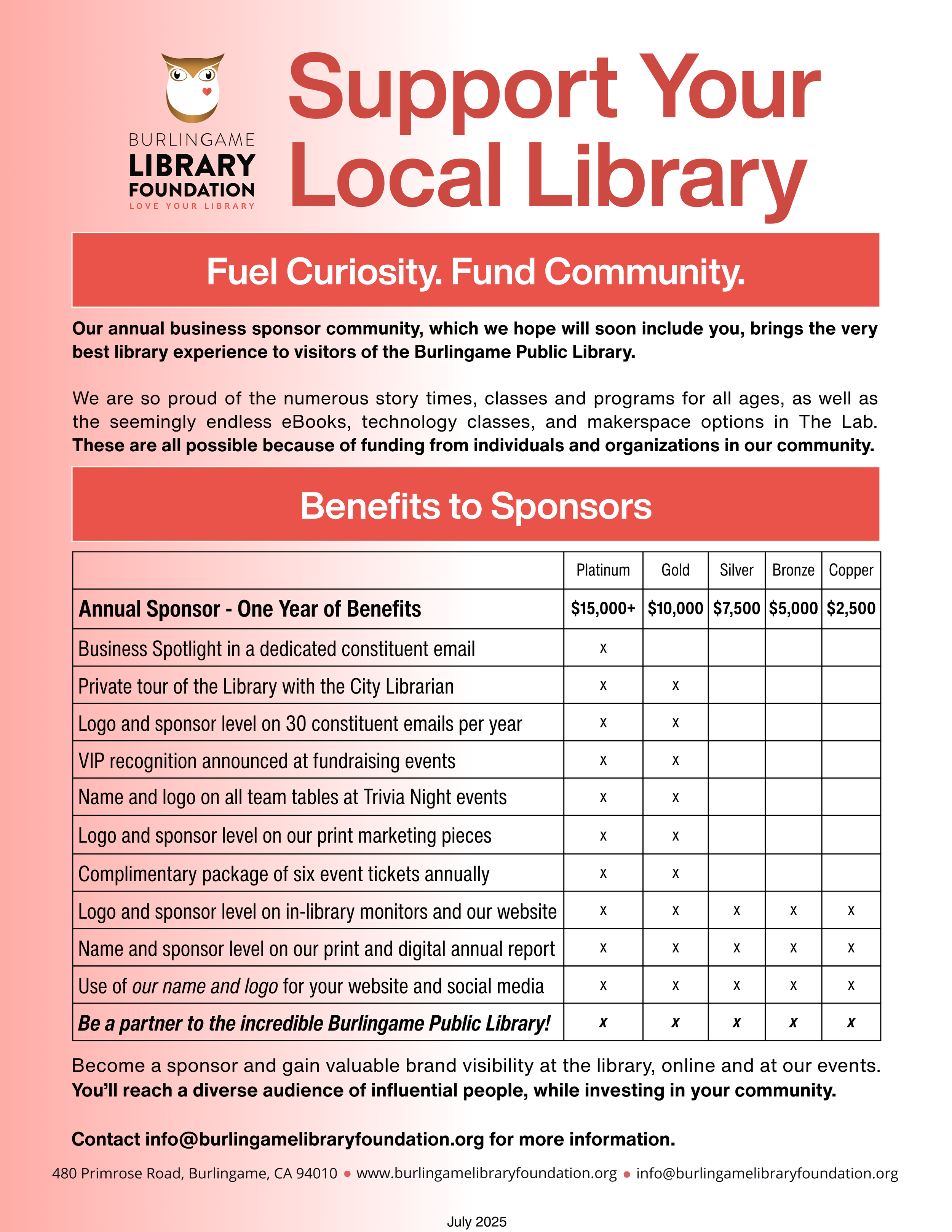 Please email us at info@burlingamelibraryfoundation.org to talk about sponsorship options.